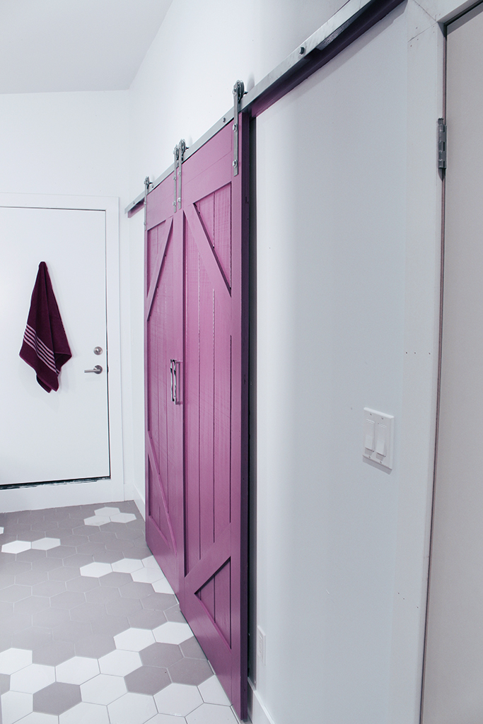 Since we’re working with an open floor plan, we’ll be carrying the colour scheme from the bathroom into the bedroom. We’ll be painting the walls in PARA Sterling Spoon (PF71). Since the barn doors we built for our closet can be seen from the bedroom space, we’re working in accents throughout the room to play off the colour -PARA Pixie Pop (PF3). Think bedding, accent pillows, window coverings, etc…