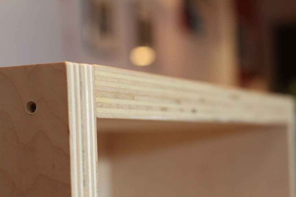 Similar to our media wall console, we built the boxes out of 3/4″ plywood that is laminated to give it an 1 1/2″ thickness and then finished the raw edges. The finished plywood edge will help give the boxes a bit of the industrial look we’re going for.