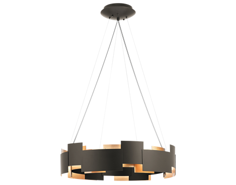 The Moderne was the one that initially caught our attention because of its strikingly unique design. It features up and down directional LED lighting that is separated by offset square and rectangular panels and a suspended cable design. The circular styling of the fixture immediately made me think of the kind of crown T’Challa might wear which tied in perfectly with our Black Panther inspired design. Given the large scale of the room however, we were initially unsure whether it would provide enough light for the space – which is why we had our eye on another fixture.