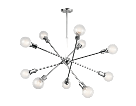 The Armstrong was our second choice for the ceiling fixture. With its classic Mid-Century modern design we knew it would also make a beautiful complement to the MCM desk that we designed for the space. The Armstrong features a “sputnik” design and adjustable arms which allow the shape to be customized to your space. A 10 light chandelier, we had no concerns about the amount of light this fixture would provide.