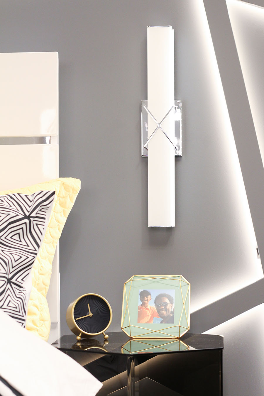 We also installed the Trinsic 22″ LED Bath Light on the wall next to Kash’s bed. This light is typically used above a vanity, but who says it needs to be confined to a bathroom?? We opted to install it vertically on the wall which makes for a fantastic bedside sconce for nighttime reading. It provides a ton of light, and the “X” styling of it complements the LED blacklighting on Kash’s geometric feature wall perfectly! #WakandaForever