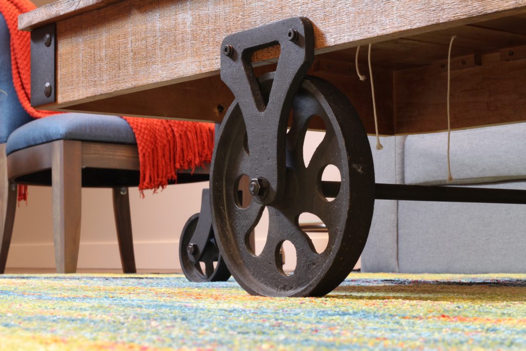 The table adds the perfect amount of rustic industrial charm to the space. So much so that I decided to create a DIY rustic pulley wall sconce to compliment it.