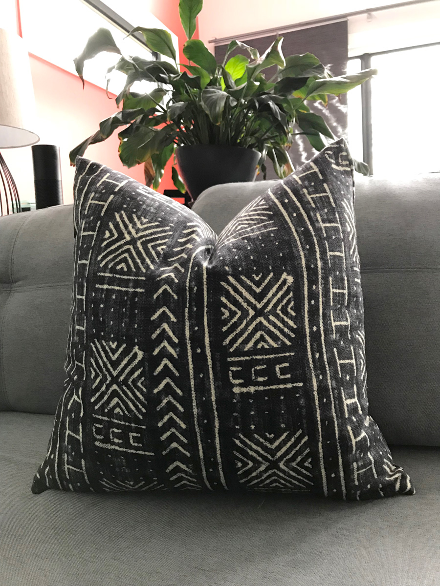 Pillow covers in Mali Mudcloth Inked, Trent Naples Yellow & Baraka Ikat Grey fabrics from Tonic Living.