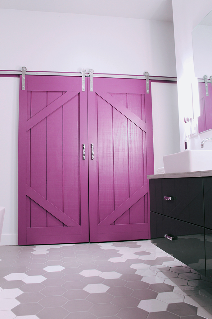 Since we’re working with an open floor plan, we’ll be carrying the colour scheme from the bathroom into the bedroom. We’ll be painting the walls in PARA Sterling Spoon (PF71). Since the barn doors we built for our closet can be seen from the bedroom space, we’re working in accents throughout the room to play off the colour -PARA Pixie Pop (PF3). Think bedding, accent pillows, window coverings, etc…