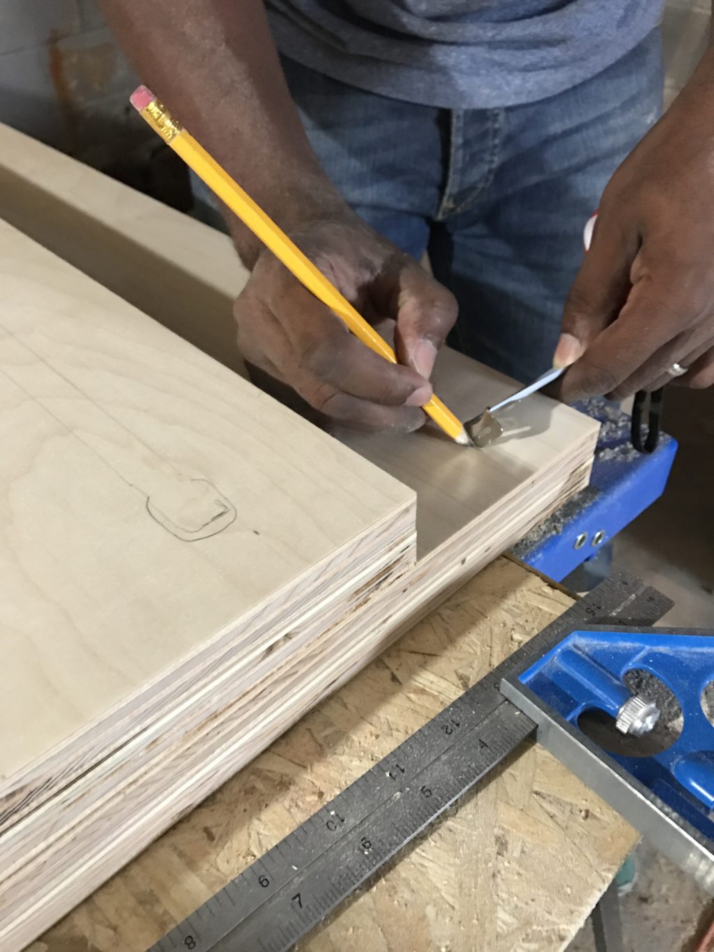 Similar to our media wall console, we built the boxes out of 3/4″ plywood that is laminated to give it an 1 1/2″ thickness and then finished the raw edges. The finished plywood edge will help give the boxes a bit of the industrial look we’re going for.