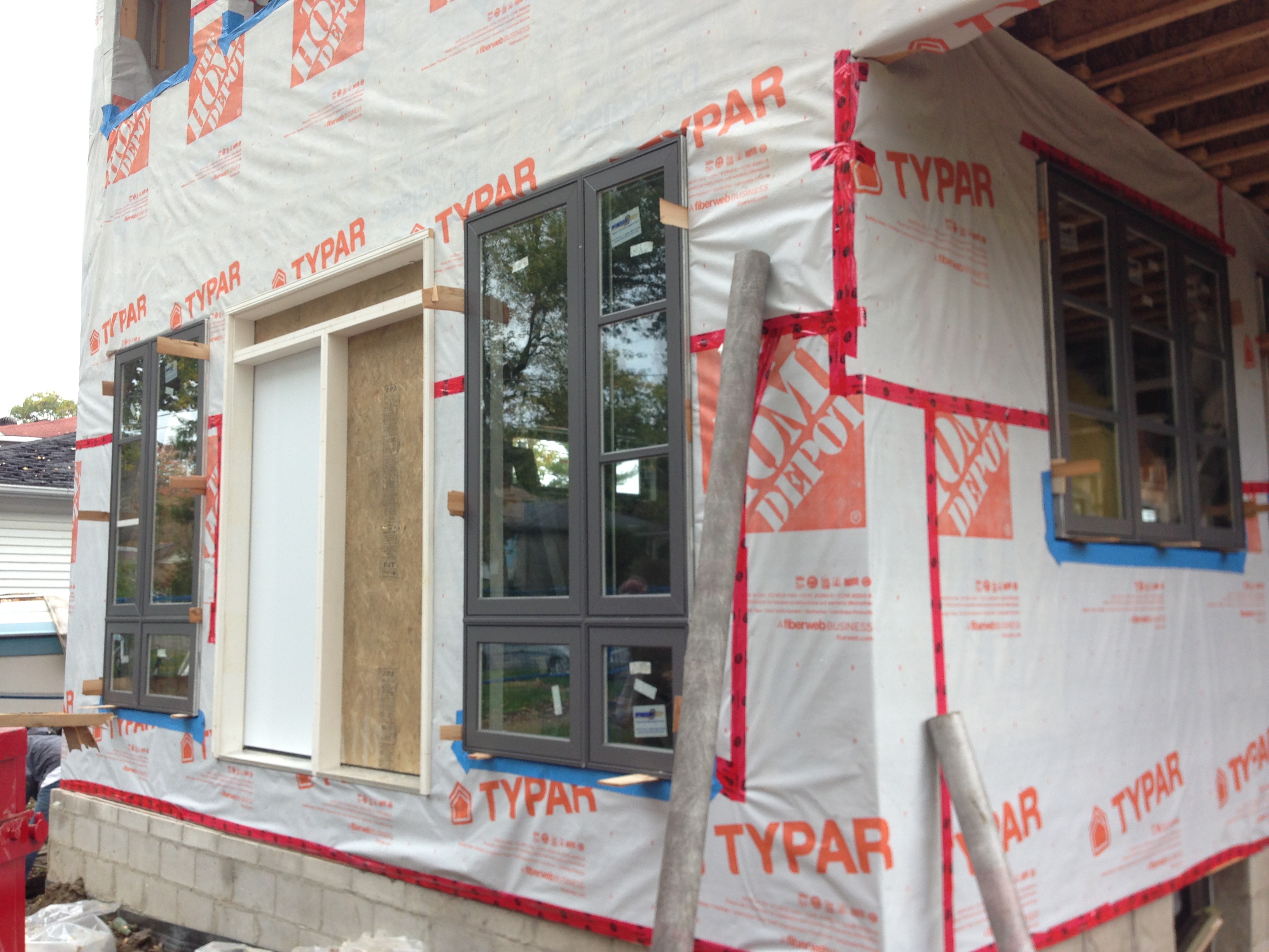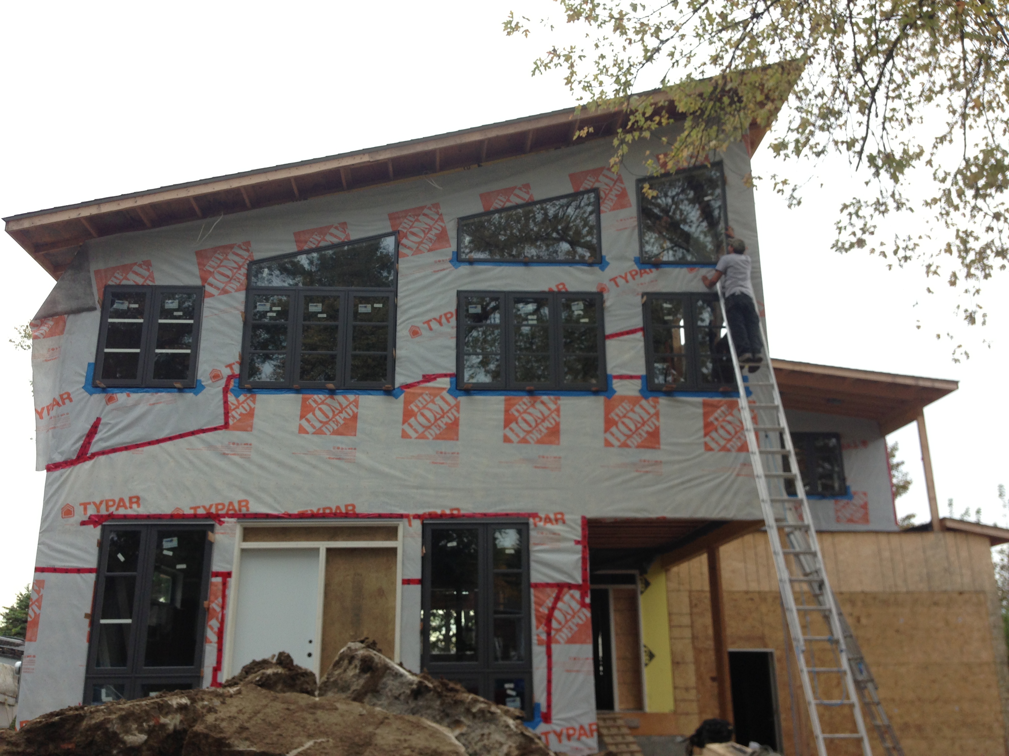 Along with the window install, the crew is hard at work turning the house into a giant Home Depot ad prepping the house for the exterior cladding – which we’ll cover in a few upcoming posts…I’m thinking this calls for another edition of Design Week. 😉
