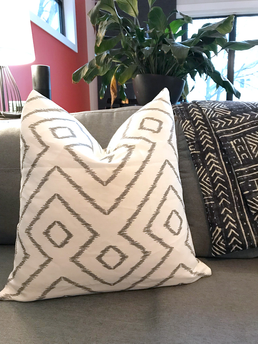 Pillow covers in Mali Mudcloth Inked, Trent Naples Yellow & Baraka Ikat Grey fabrics from Tonic Living.